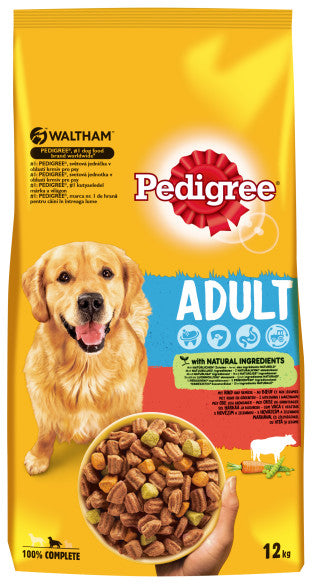 PEDIGREE Hrană uscată pentru câini Adult, cu Vită şi Legume Hrană completă pentru câini adulţi, cu vită şi legume COMPOZIȚIE: cereale*, carne şi derivate de origine animală (20%, inclusiv 4% vită în granulele maro**), uleiuri şi grăsimi (inclusiv ulei de floarea soarelui 0.4%), derivate de origine vegetală (inclusiv pulpă de sfeclă uscată 3%*), extracte din…